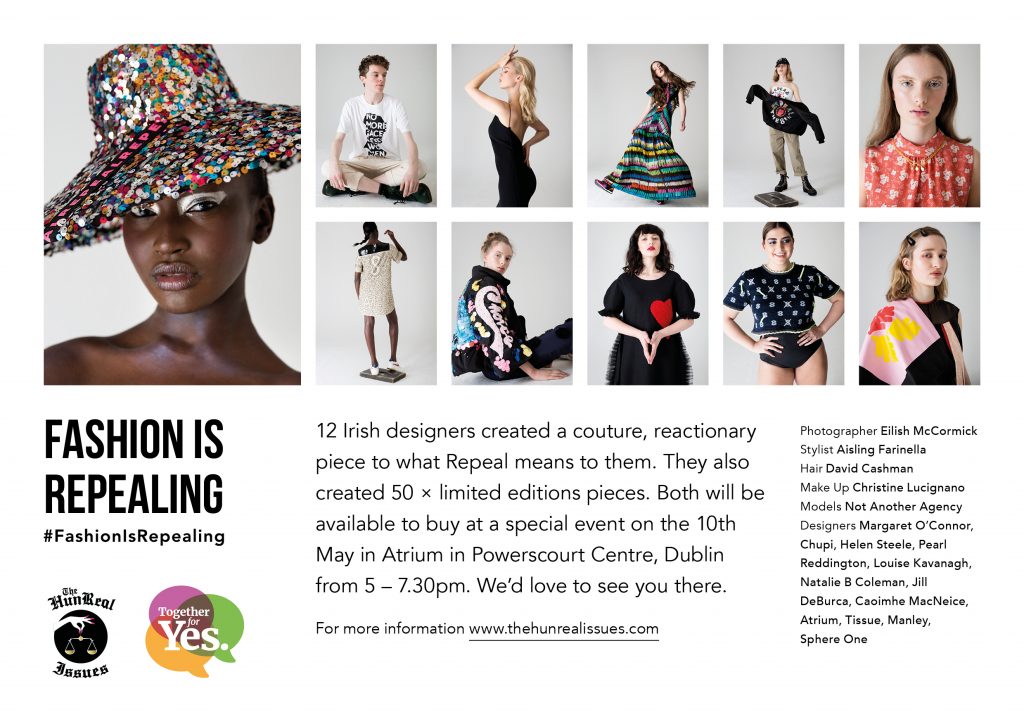 The ‘Fashion is Repealing’ collection will also feature hats, necklaces, jackets, dresses and tees created by the fashion luminaries in the name of repeal. All proceeds raised go directly to Together For Yes, the National Civil Society Campaign to remove the Eighth Amendment from the Constitution.