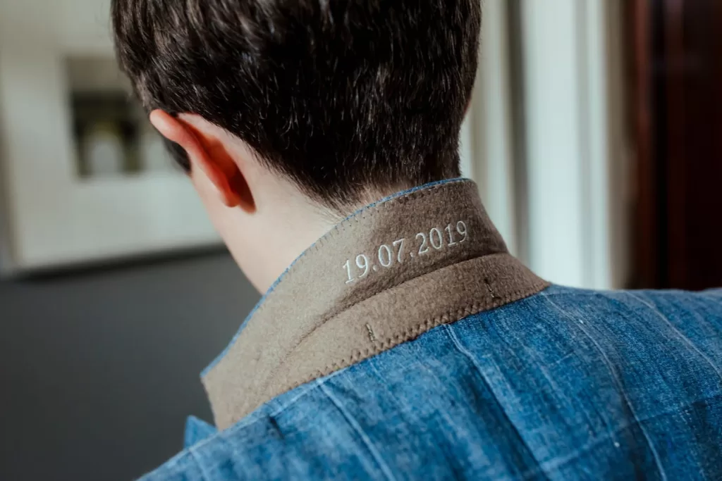 T: I chose a mix-and-match look, with a light blue window check jacket and a matching navy waistcoat and trousers. I chose to embroider the date of the wedding on the back of the collar to make that bit more special.