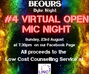 On Sunday, Beours Dyke Night in Cork bring back their Virtual Open Mic Night for the fourth time. Always a great time, and always for a great cause, proceeds will go to LINC’s counselling service, so make sure to show your support.