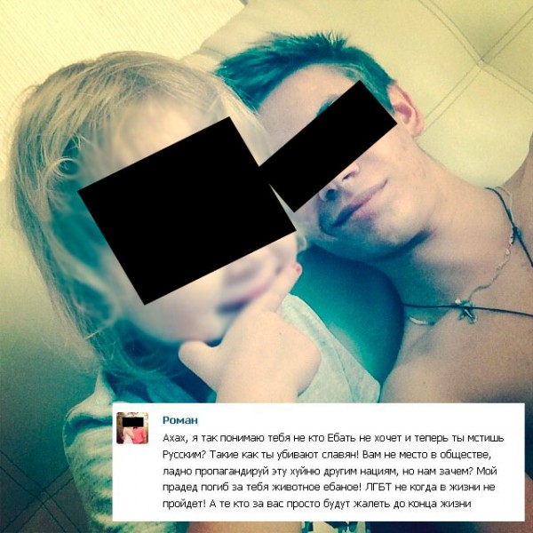 “Ahaha,” posts ‘Roman’. “I get it: nobody wants to fuck you, and now you’re taking it out on Russians? People like you are the ones killing Slavs! There’s no place for you in society. Fine, go and promote this shit in other countries, but why here? My great grandfather died for you, you fucking beast! LGBT will never be tolerated! And the people who have supported you will regret it for the rest of their lives.”