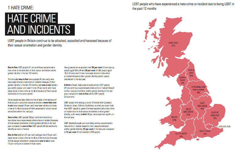 The survey, which surveyed the attitudes of over 5000 LGBTs across Britain about their experiences of homo/transphobia and discrimination based on in a report called ‘LGBT in Britain – Hate Crime and Discrimination‘.