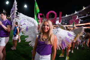 The group pose for a photo together before heading to the Sydney Cricket Ground. This year’s outfits saw them dressed in the colours of the progress flag for the theme ‘Rainbow Love Language.’ The large wings were inspired by Cupid, the god of love and attraction.