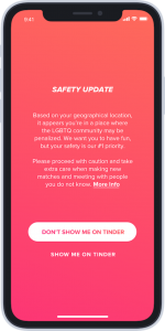 Tinder collaborated with ILGA World (International Lesbian Gay Bisexual Trans and Intersex Association) to create the new safety feature, researching the countries that still ban same-sex relationships by law.