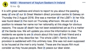 MASI – The Movement of Asylum Seekers in Ireland earlier posted to their Facebook page about the death of a trans woman in direct provision.