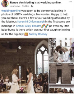 In September, Spiritual Ceremonies Ireland called Weddingsonline out publicly when images of LGBTQ+ couples were removed from an Instagram takeover that Spiritual Ceremonies Ireland had done in the weeks previous.