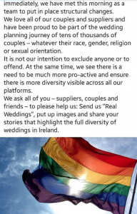 There was a huge backlash last month, when one of the most prominent Irish wedding websites, Weddingsonline, was accused of homophobia and a lack of diversity. I’ll take a moment here to say for those of you who missed it, things have since drastically changed on their social channels… so on the surface it wouldn’t look like there is an issue.