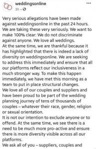 It was a stock image of a rainbow flag accompanied with the text: “We want to make it 100% clear we do not discriminate against anyone. We love all weddings. We are thankful because it has highlighted a lack of diversity on Weddingsonline. We are seeking to address this immediately and ensure that all platforms reflect our inclusiveness in a much stronger way.”