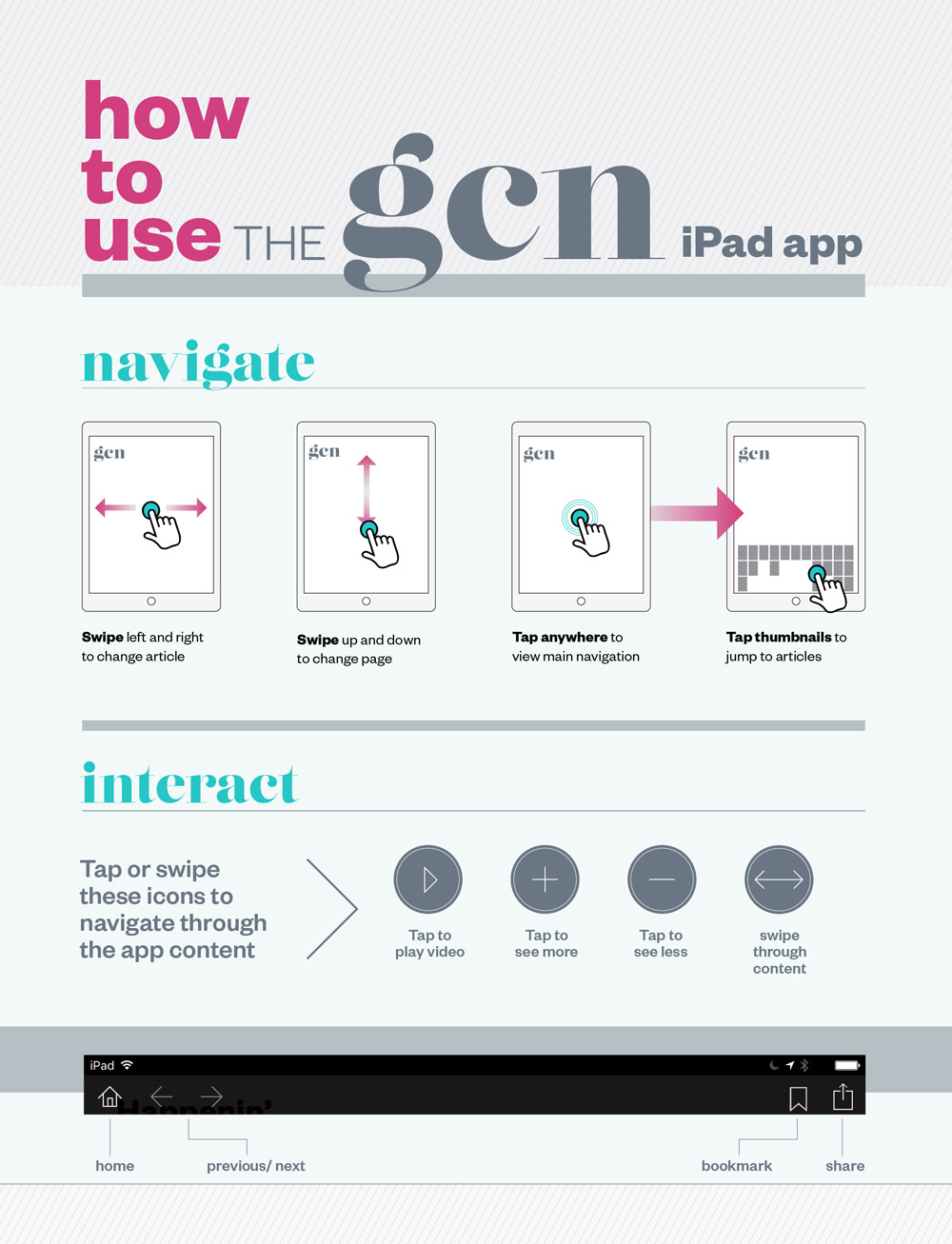 The GCN iPad App how to use page with illustrations of how to use the new app
