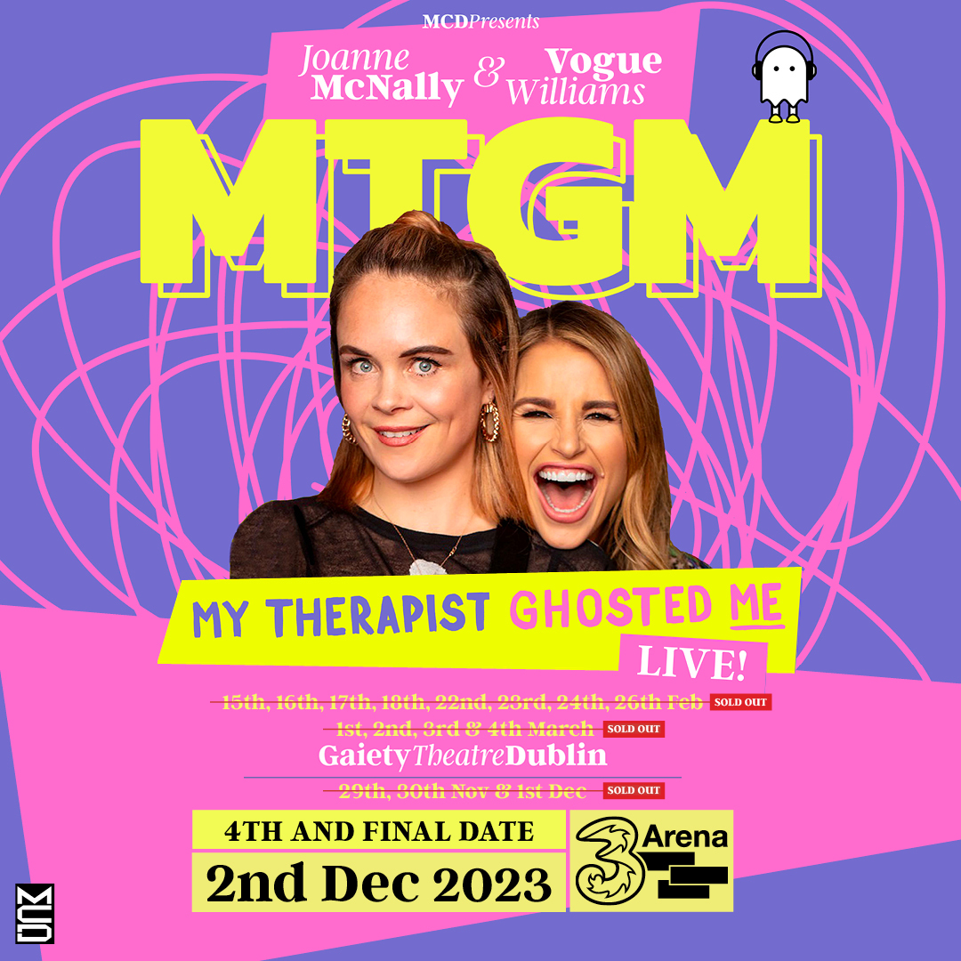 Joanne McNally and Vogue Williams are co-hosts of the hilarious podcast My Therapist Ghosted Me. After performing several incredible sold-out live shows, they’ve added one more night to their tour on December 2, 2023, and lucky for GCN readers, we’ve got tickets to giveaway!
